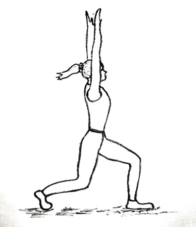 Myofascial step squat with hands up! Stay in this position for a moment.
